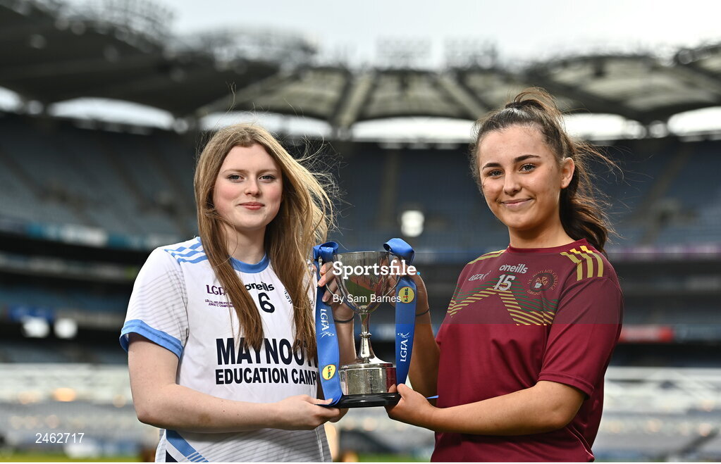 21 March 2023; In attendance at the Lidl All-Ireland Post-Primary Schools Finals Captains day are Lidl All Ireland Post Primary School Junior ‘B’ Championship captains Casey Noone of Maynooth EC, Kildare, left, and Orla McAlinden of St Ronans, Lurgan, Armagh. The 2023 Finals will be contested at Senior and Junior levels, with three finals in each grade. All three Lidl All-Ireland PPS Senior Finals will be live-streamed. Photo by Sam Barnes/Sportsfile