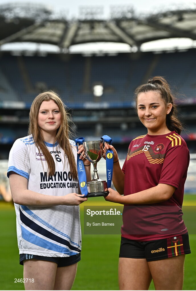 21 March 2023; In attendance at the Lidl All-Ireland Post-Primary Schools Finals Captains day are Lidl All Ireland Post Primary School Junior ‘B’ Championship captains Casey Noone of Maynooth EC, Kildare, left, and Orla McAlinden of St Ronans, Lurgan, Armagh. The 2023 Finals will be contested at Senior and Junior levels, with three finals in each grade. All three Lidl All-Ireland PPS Senior Finals will be live-streamed. Photo by Sam Barnes/Sportsfile