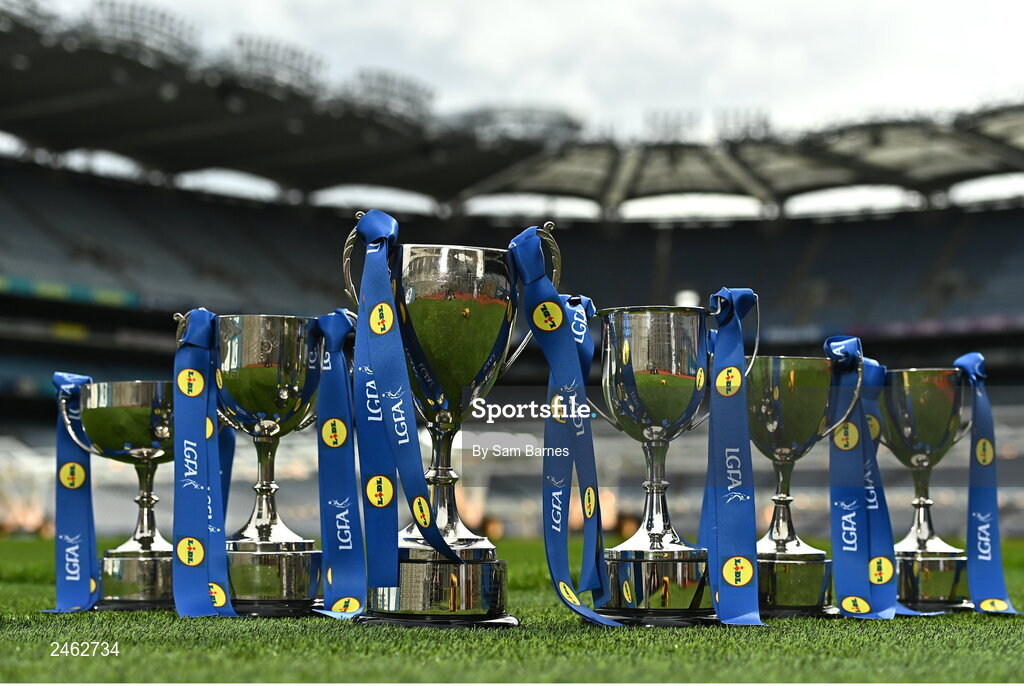 21 March 2023; A general view of the cups during the Lidl All-Ireland Post-Primary Schools Finals Captains day. The 2023 Finals will be contested at Senior and Junior levels, with three finals in each grade. All three Lidl All-Ireland PPS Senior Finals will be live-streamed. Photo by Sam Barnes/Sportsfile