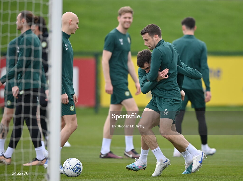 21 March 2023; Seamus Coleman and Troy Parrott during a Republic of Ireland training session at the FAI National Training Centre in Abbotstown, Dublin. Photo by Stephen McCarthy/Sportsfile