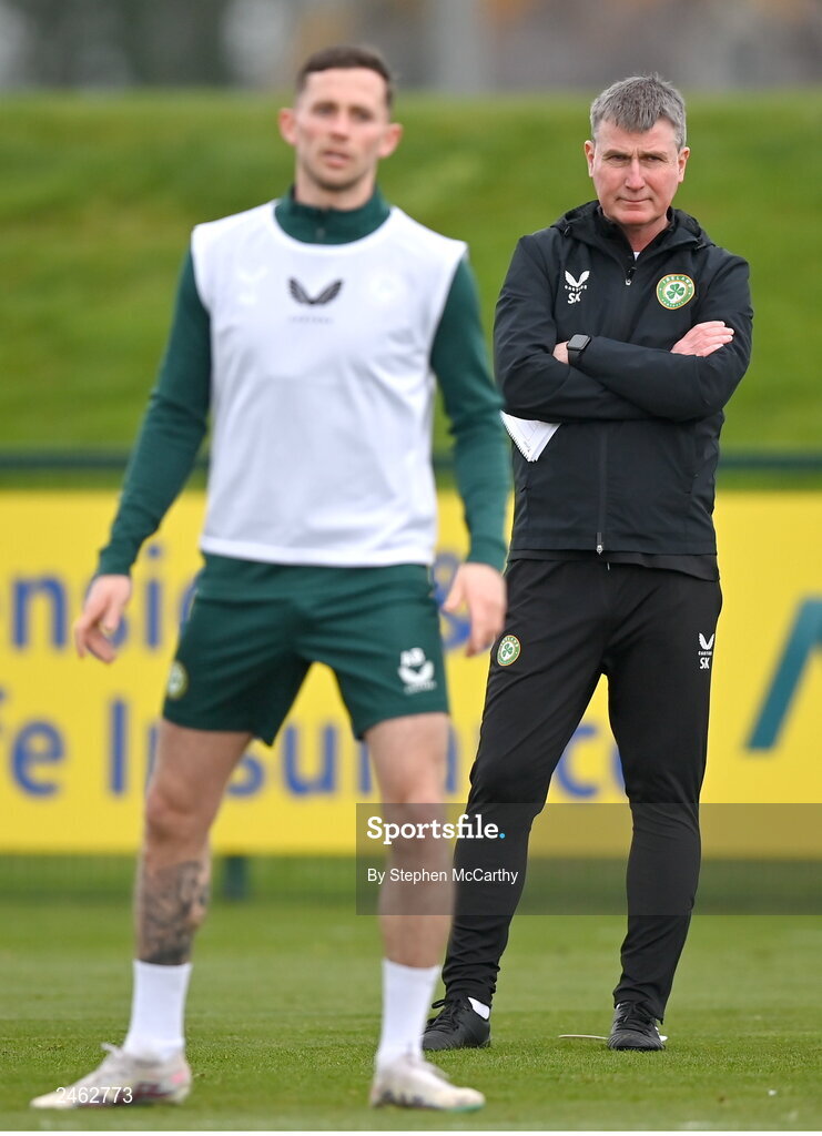 21 March 2023; Manager Stephen Kenny and Alan Browne during a Republic of Ireland training session at the FAI National Training Centre in Abbotstown, Dublin. Photo by Stephen McCarthy/Sportsfile