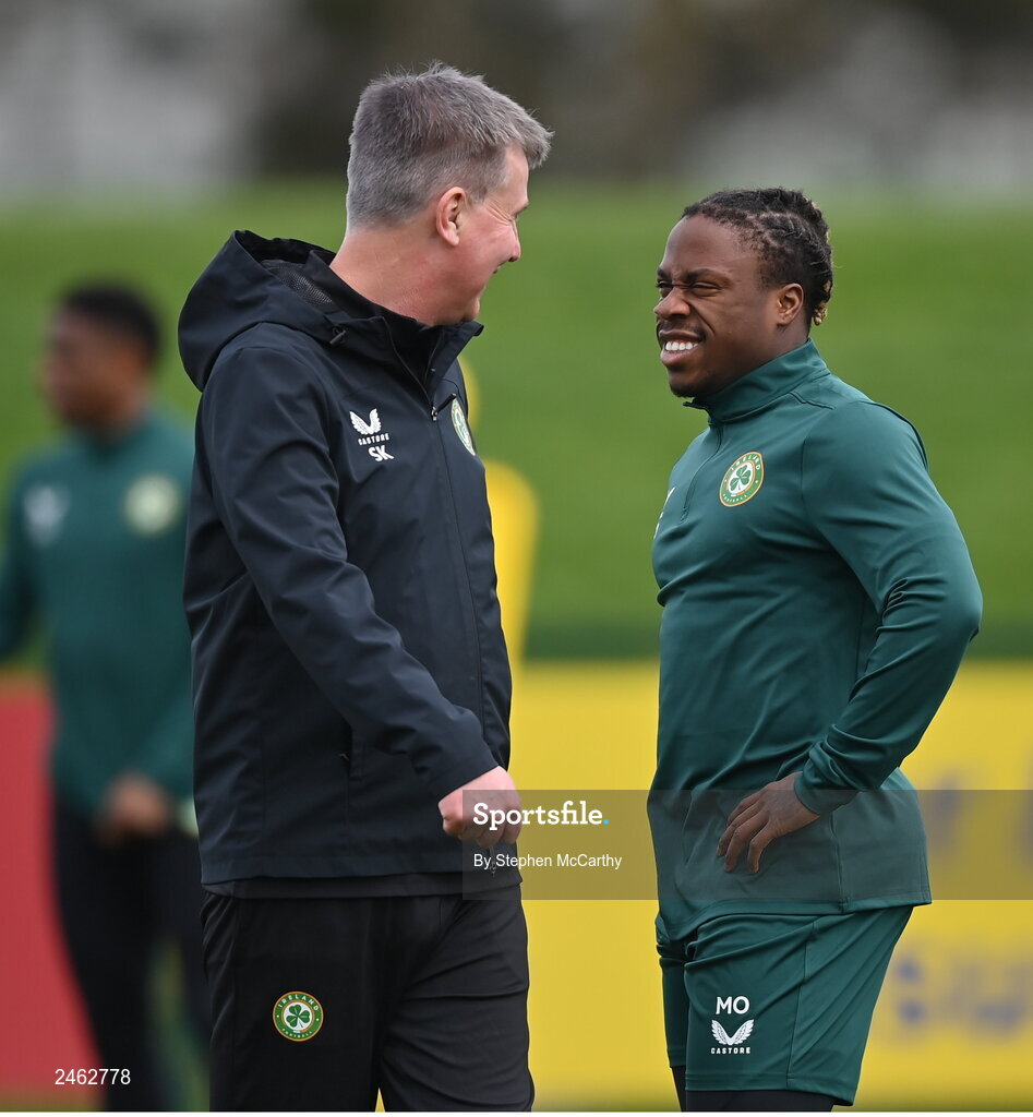21 March 2023; Manager Stephen Kenny and Michael Obafemi during a Republic of Ireland training session at the FAI National Training Centre in Abbotstown, Dublin. Photo by Stephen McCarthy/Sportsfile