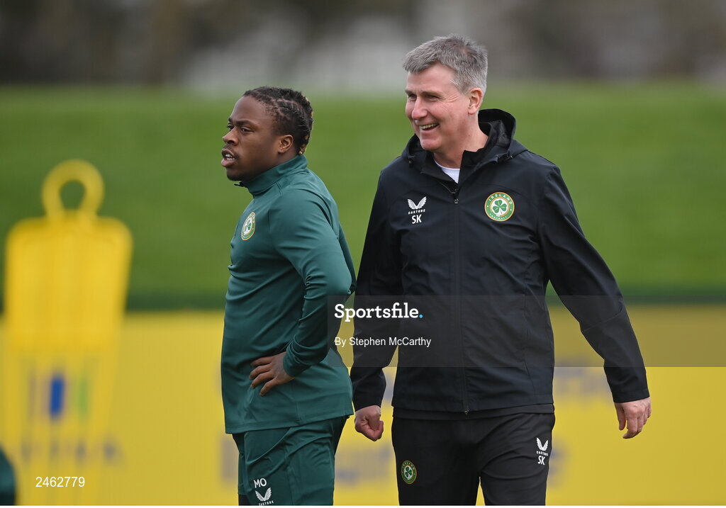 21 March 2023; Manager Stephen Kenny and Michael Obafemi during a Republic of Ireland training session at the FAI National Training Centre in Abbotstown, Dublin. Photo by Stephen McCarthy/Sportsfile