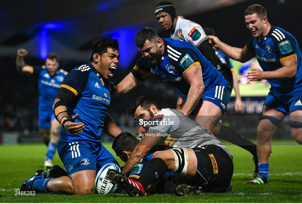 24 March 2023; Michael Ala'alatoa and Michael Milne of Leinster celebrates as Max Deegan of Leinster scores his side's fourth try during the United Rugby Championship match between Leinster and DHL Stormers at the RDS Arena in Dublin. Photo by Harry Murphy/Sportsfile