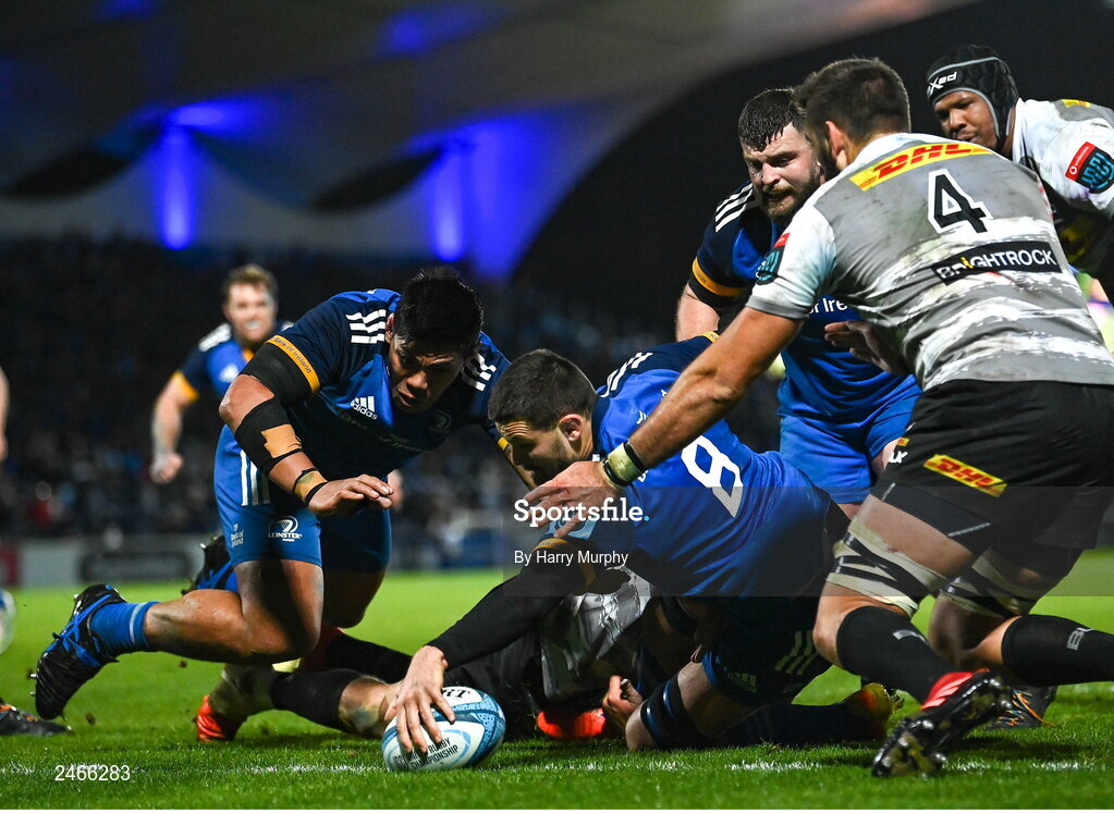24 March 2023; Max Deegan of Leinster scores his side's fourth try during the United Rugby Championship match between Leinster and DHL Stormers at the RDS Arena in Dublin. Photo by Harry Murphy/Sportsfile