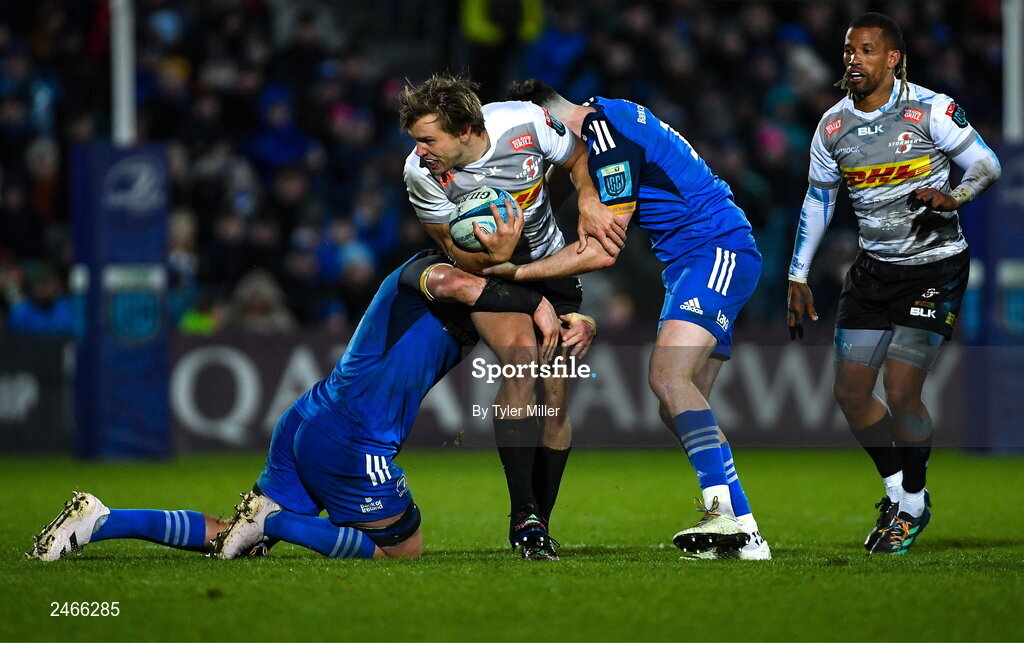 24 March 2023; Dan du Plessis of DHL Stormers is tackled by Rhys Ruddock, left, and Harry Byrne of Leinster during the United Rugby Championship match between Leinster and DHL Stormers at the RDS Arena in Dublin. Photo by Tyler Miller/Sportsfile