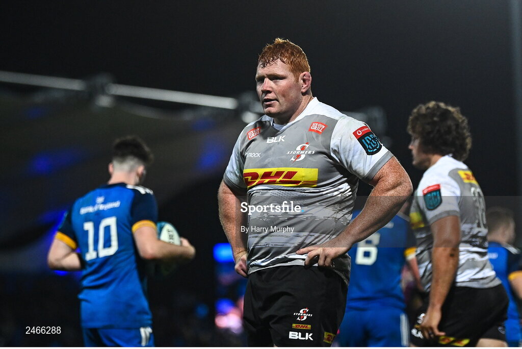24 March 2023; Steven Kitshoff of DHL Stormers reacts after his side conceded a fourth try during the United Rugby Championship match between Leinster and DHL Stormers at the RDS Arena in Dublin. Photo by Harry Murphy/Sportsfile