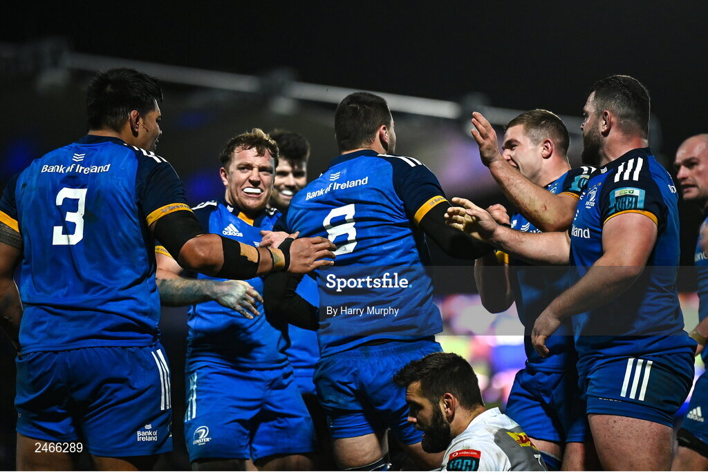 24 March 2023; Max Deegan of Leinster, 8, celebrates with teammates after scoring his side's fourth try during the United Rugby Championship match between Leinster and DHL Stormers at the RDS Arena in Dublin. Photo by Harry Murphy/Sportsfile