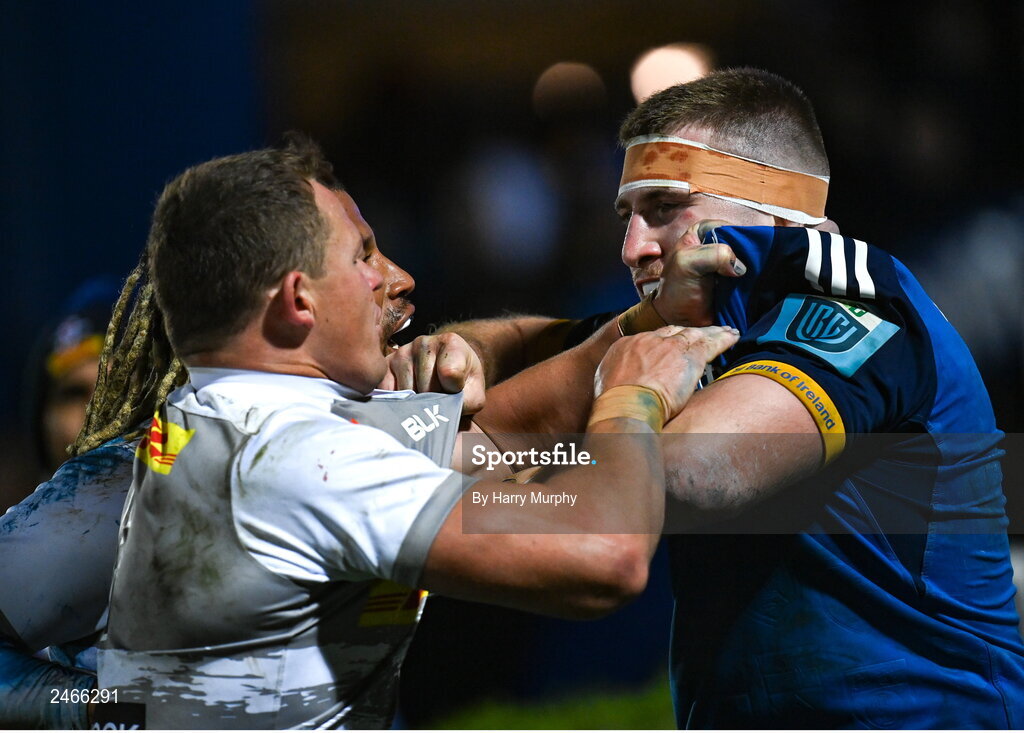 24 March 2023; John McKee of Leinster tussles with Deon Fourie of DHL Stormers during the United Rugby Championship match between Leinster and DHL Stormers at the RDS Arena in Dublin. Photo by Harry Murphy/Sportsfile