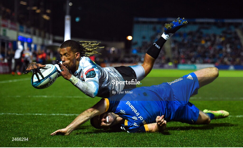 24 March 2023; Clayton Bloometjies of DHL Stormers dives over to score his side's third try despite the efforts of Dave Kearney of Leinster during the United Rugby Championship match between Leinster and DHL Stormers at the RDS Arena in Dublin. Photo by Tyler Miller/Sportsfile