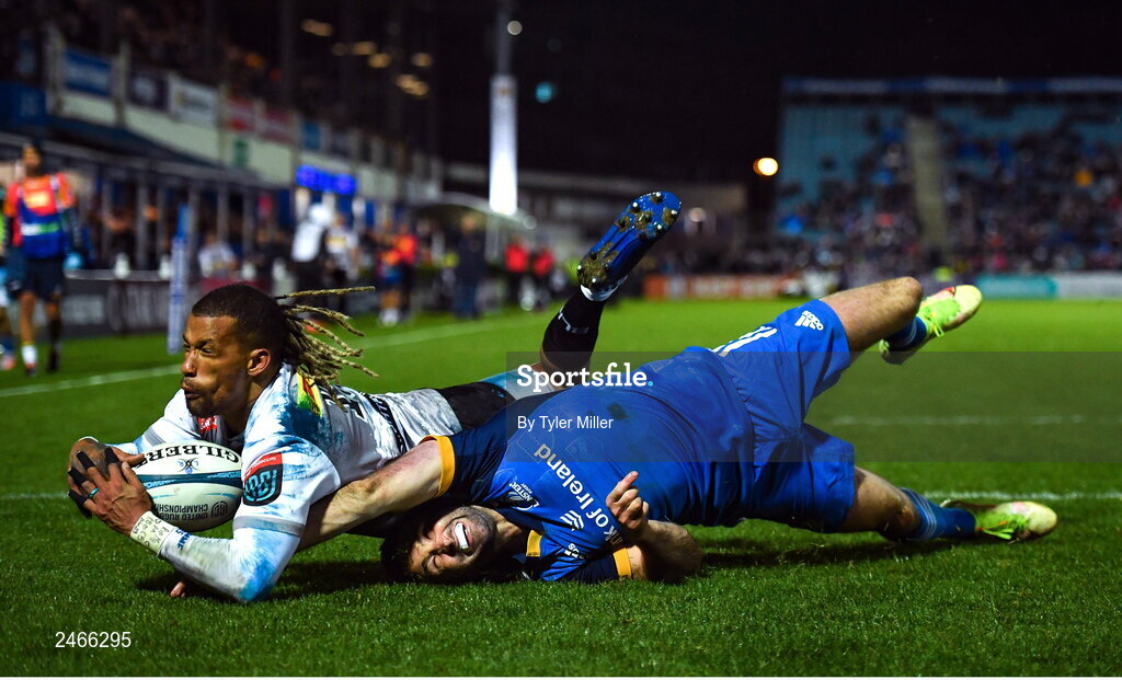24 March 2023; Clayton Bloometjies of DHL Stormers dives over to score his side's third try despite the efforts of Dave Kearney of Leinster during the United Rugby Championship match between Leinster and DHL Stormers at the RDS Arena in Dublin. Photo by Tyler Miller/Sportsfile