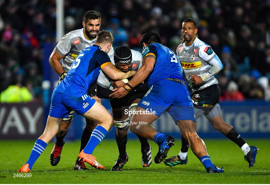 24 March 2023; Marvin Orie of DHL Stormers is tackled by Jordan Larmour, left, and Michael Ala'Alatoa of Leinster during the United Rugby Championship match between Leinster and DHL Stormers at the RDS Arena in Dublin. Photo by Tyler Miller/Sportsfile