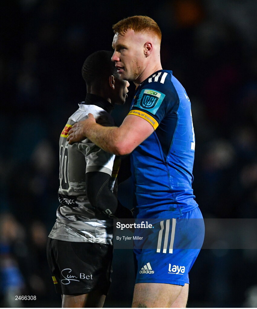 24 March 2023; Manie Libbok of DHL Stormers and Ciarán Frawley of Leinster after the United Rugby Championship match between Leinster and DHL Stormers at the RDS Arena in Dublin. Photo by Tyler Miller/Sportsfile