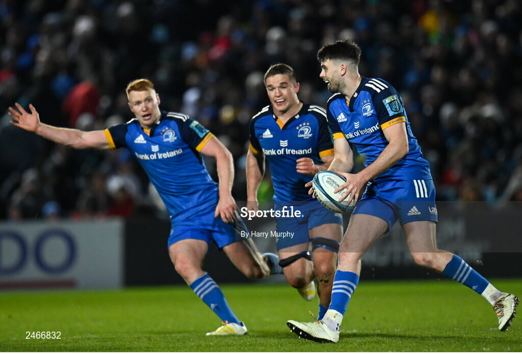 24 March 2023; Harry Byrne, right, Scott Penny and Ciarán Frawley of Leinster during the United Rugby Championship match between Leinster and DHL Stormers at the RDS Arena in Dublin. Photo by Harry Murphy/Sportsfile