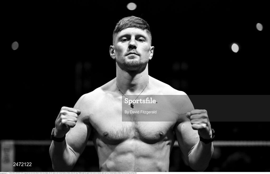 31 March 2023; (EDITOR'S NOTE; Image has been converted to black & white) Jason Quigley after his weigh in at the National Stadium in Dublin, ahead of his Super Middleweight bout against Gabor Gorbics on Saturday night, April 1st, at National Stadium in Dublin. Photo by David Fitzgerald/Sportsfile