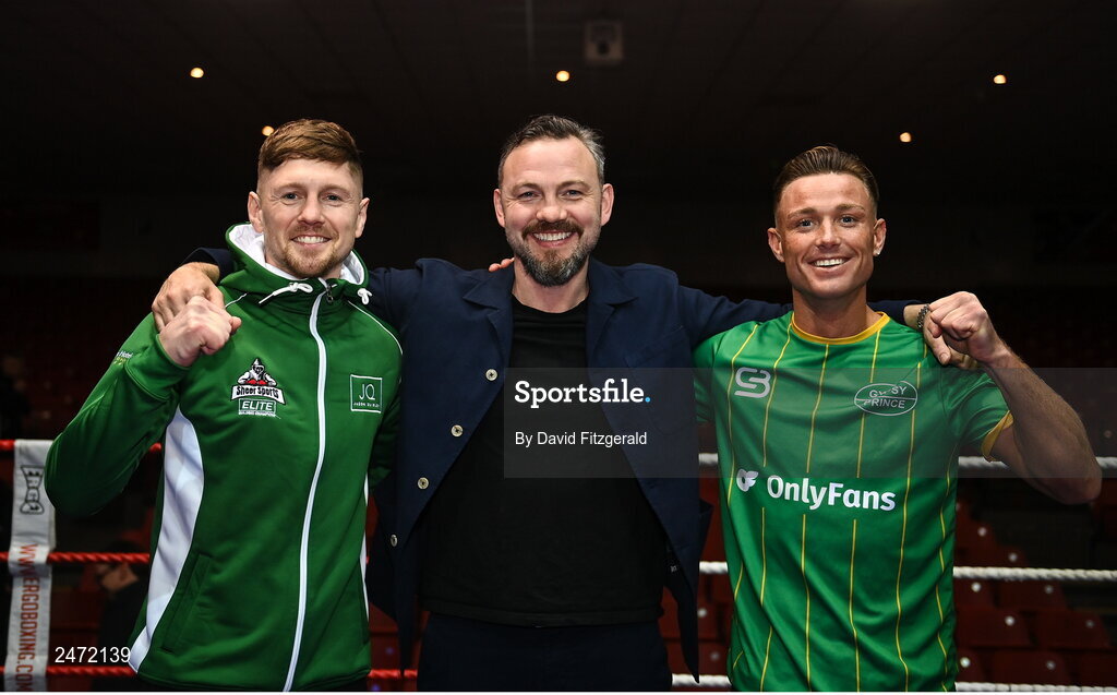 31 March 2023; Boxing trainer Andy Lee, centre, with Jason Quigley, left, and Paddy Donovan ahead of their boxing bouts on Saturday night, April 1st, at National Stadium in Dublin. Photo by David Fitzgerald/Sportsfile