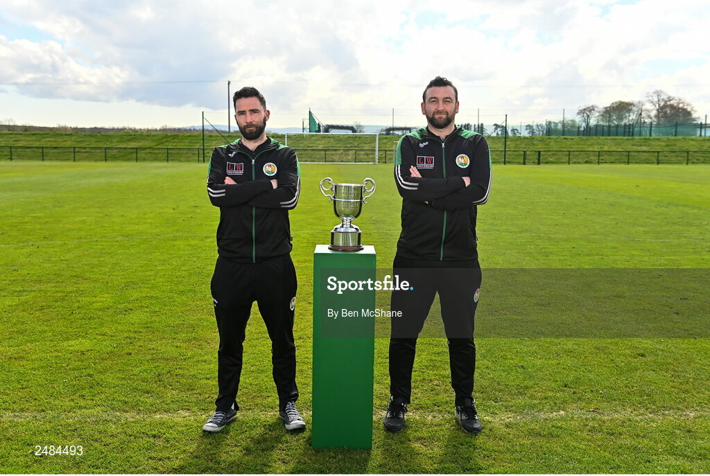 21 April 2023; Cockhill Celtic captain James Bradley, left, and manager Gavin Cullen during the FAI Intermediate Cup Final media event at FAI HQ in Abbotstown, Dublin. Photo by Ben McShane/Sportsfile