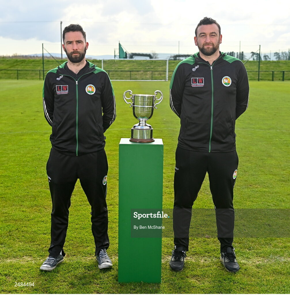 21 April 2023; Cockhill Celtic captain James Bradley, left, and manager Gavin Cullen during the FAI Intermediate Cup Final media event at FAI HQ in Abbotstown, Dublin. Photo by Ben McShane/Sportsfile