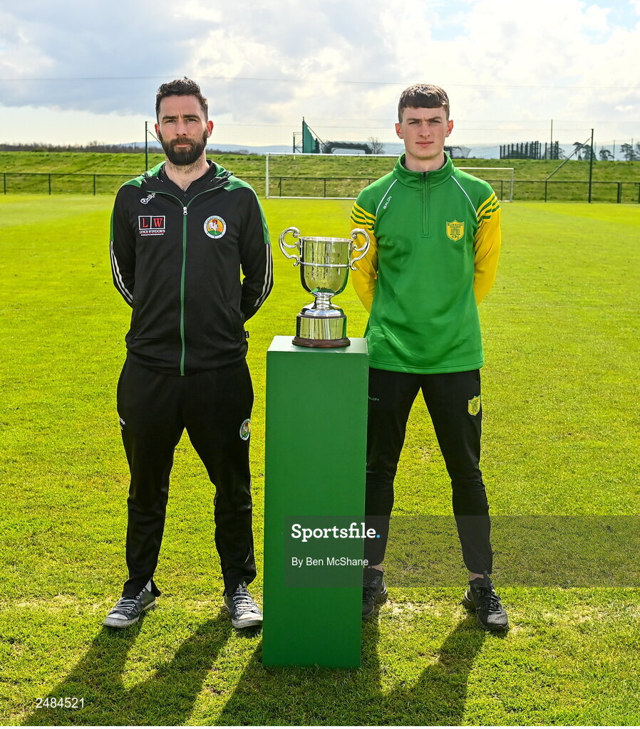 21 April 2023; Cockhill Celtic captain James Bradley, left, and Rockmount AFC player Luke Casey during the FAI Intermediate Cup Final media event at FAI HQ in Abbotstown, Dublin. Photo by Ben McShane/Sportsfile