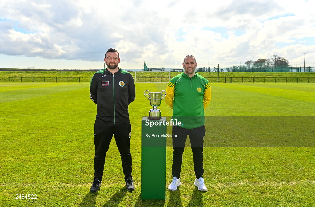 21 April 2023; Cockhill Celtic manager Gavin Cullen, left, and Rockmount AFC manager Edward Kenny during the FAI Intermediate Cup Final media event at FAI HQ in Abbotstown, Dublin. Photo by Ben McShane/Sportsfile