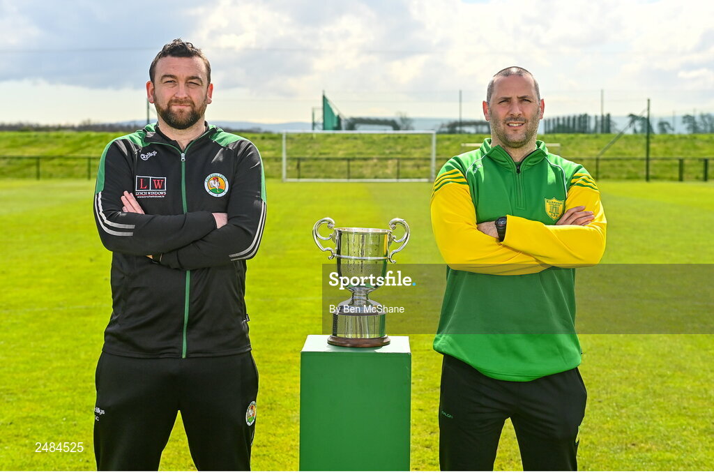 21 April 2023; Cockhill Celtic manager Gavin Cullen, left, and Rockmount AFC manager Edward Kenny during the FAI Intermediate Cup Final media event at FAI HQ in Abbotstown, Dublin. Photo by Ben McShane/Sportsfile