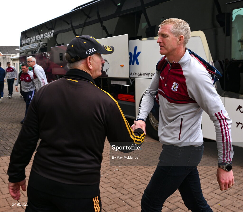 30 April 2023; Galway manager Henry Shefflin is greeted on his arrival by Kilkenny kitman Rackard Coady before the Leinster GAA Hurling Senior Championship Round 2 match between Kilkenny and Galway at UPMC Nowlan Park in Kilkenny. Photo by Ray McManus/Sportsfile