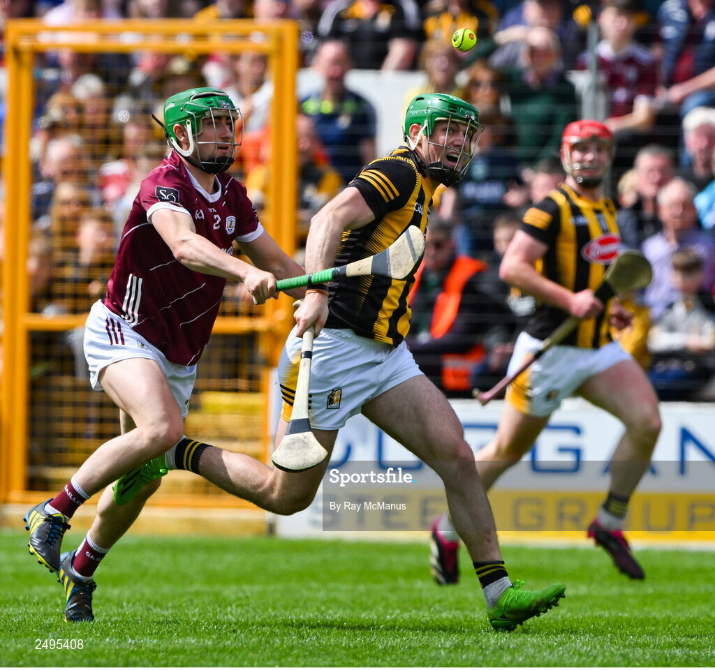 30 April 2023; Eoin Cody of Kilkenny is tackled by Jack Grealish of Galway during the Leinster GAA Hurling Senior Championship Round 2 match between Kilkenny and Galway at UPMC Nowlan Park in Kilkenny. Photo by Ray McManus/Sportsfile
