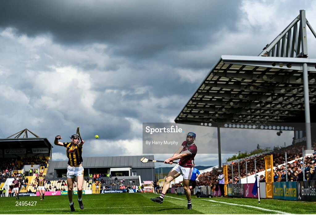 30 April 2023; Conor Cooney of Galway scores a point despite the attention of David Blanchfield of Kilkenny during the Leinster GAA Hurling Senior Championship Round 2 match between Kilkenny and Galway at UPMC Nowlan Park in Kilkenny. Photo by Harry Murphy/Sportsfile