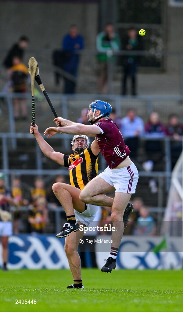 30 April 2023; Conor Cooney of Galway is tackled by Pádraig Walsh of Kilkenny during the Leinster GAA Hurling Senior Championship Round 2 match between Kilkenny and Galway at UPMC Nowlan Park in Kilkenny. Photo by Ray McManus/Sportsfile