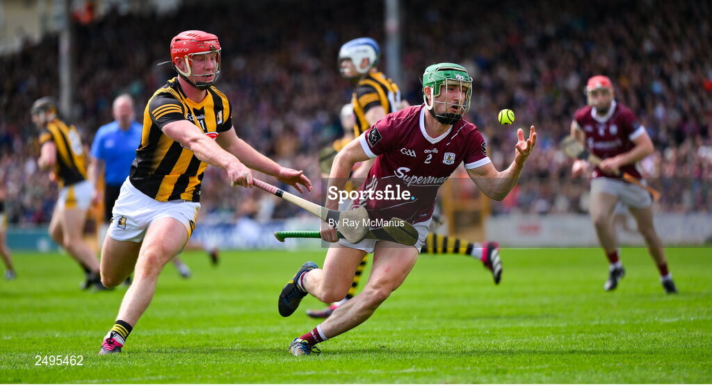 30 April 2023; Jack Grealish of Galway is tackled by Adrian Mullen of Kilkenny during the Leinster GAA Hurling Senior Championship Round 2 match between Kilkenny and Galway at UPMC Nowlan Park in Kilkenny. Photo by Ray McManus/Sportsfile