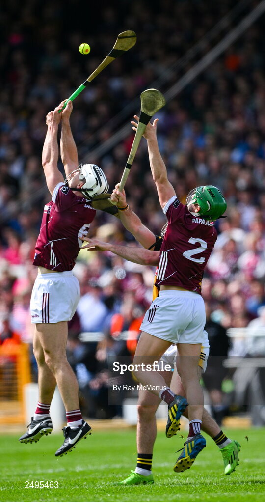 30 April 2023; Daithi Burke, left, and Jack Grealish of Galway compete with Eoin Cody of Kilkenny for possession during the Leinster GAA Hurling Senior Championship Round 2 match between Kilkenny and Galway at UPMC Nowlan Park in Kilkenny. Photo by Ray McManus/Sportsfile