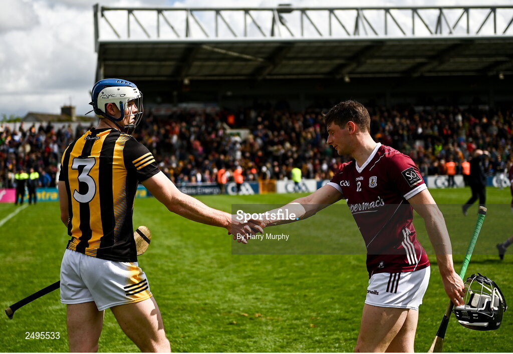 30 April 2023; Huw Lawlor of Kilkenny and Jack Grealish of Galway shake hands after the Leinster GAA Hurling Senior Championship Round 2 match between Kilkenny and Galway at UPMC Nowlan Park in Kilkenny. Photo by Harry Murphy/Sportsfile