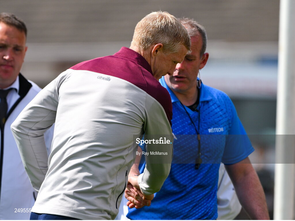 30 April 2023; Galway manager Henry Shefflin shakes hands with referee Johnny Murphy after the Leinster GAA Hurling Senior Championship Round 2 match between Kilkenny and Galway at UPMC Nowlan Park in Kilkenny. Photo by Ray McManus/Sportsfile