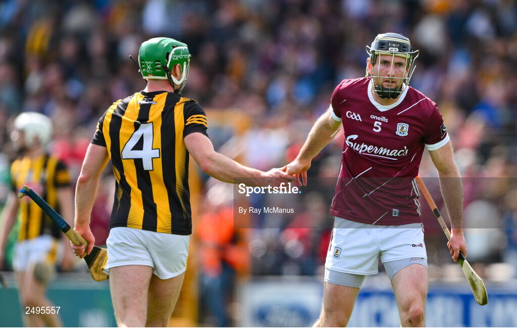 30 April 2023; Tommy Walsh of Kilkenny and Padraic Mannion of Galway shake hands after the Leinster GAA Hurling Senior Championship Round 2 match between Kilkenny and Galway at UPMC Nowlan Park in Kilkenny. Photo by Ray McManus/Sportsfile