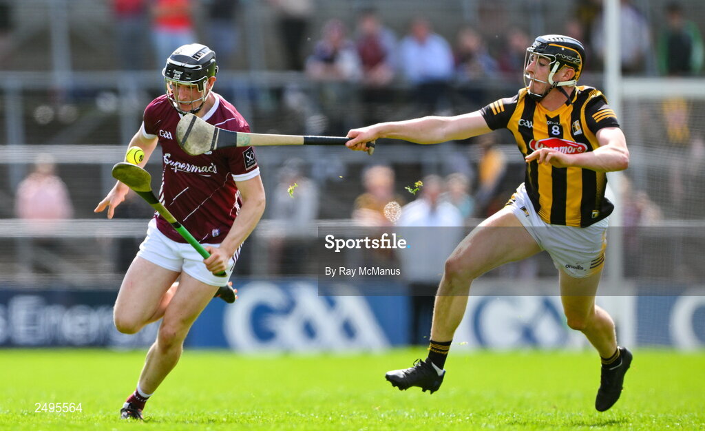 30 April 2023; Kevin Cooney of Galway is tackled by Darragh Corcoran of Kilkenny during the Leinster GAA Hurling Senior Championship Round 2 match between Kilkenny and Galway at UPMC Nowlan Park in Kilkenny. Photo by Ray McManus/Sportsfile