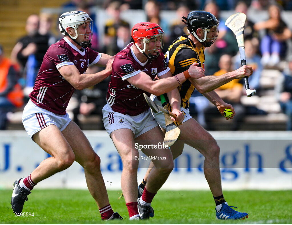 30 April 2023; Conor Fogarty of Kilkenny under pressure from Galway players Daithi Burke, left, and TJ Brennan during the Leinster GAA Hurling Senior Championship Round 2 match between Kilkenny and Galway at UPMC Nowlan Park in Kilkenny. Photo by Ray McManus/Sportsfile