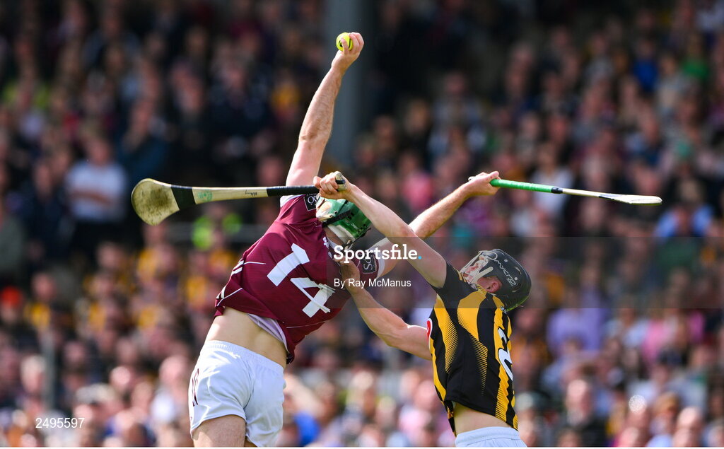 30 April 2023; Brian Concannon of Galway wins possession under pressure from Mikey Butler of Kilkenny during the Leinster GAA Hurling Senior Championship Round 2 match between Kilkenny and Galway at UPMC Nowlan Park in Kilkenny. Photo by Ray McManus/Sportsfile