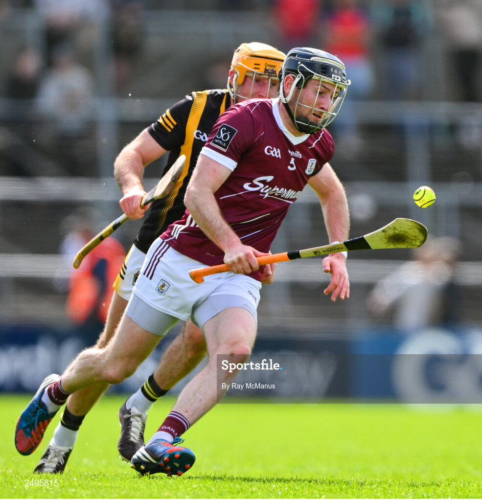 30 April 2023; Padraic Mannion of Galway races clear of Billy Ryan of Kilkenny during the Leinster GAA Hurling Senior Championship Round 2 match between Kilkenny and Galway at UPMC Nowlan Park in Kilkenny. Photo by Ray McManus/Sportsfile