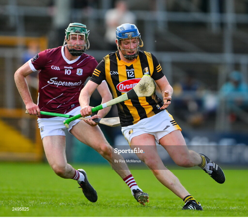 30 April 2023; John Donnelly of Kilkenny in action against Cathal Mannion of Galway during the Leinster GAA Hurling Senior Championship Round 2 match between Kilkenny and Galway at UPMC Nowlan Park in Kilkenny. Photo by Ray McManus/Sportsfile