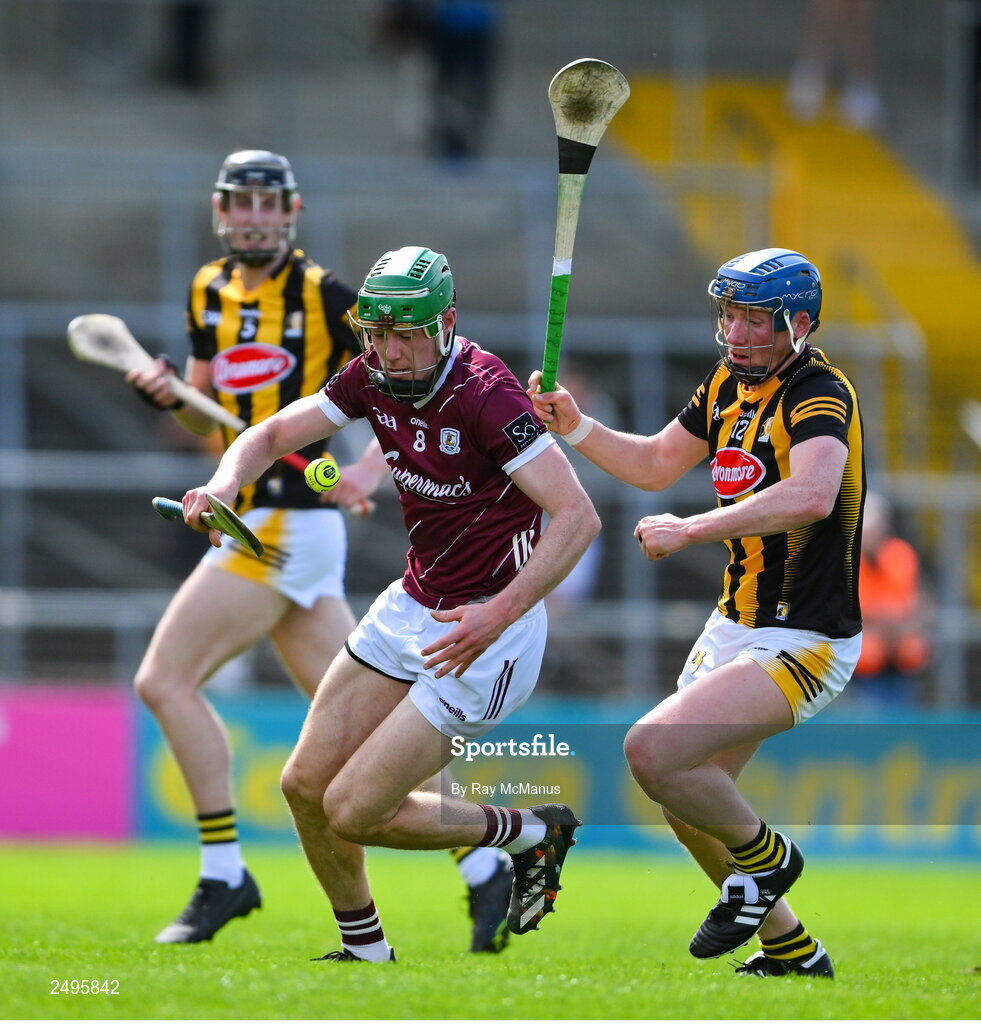 30 April 2023; Cianan Fahy of Galway in action against John Donnelly of Kilkenny during the Leinster GAA Hurling Senior Championship Round 2 match between Kilkenny and Galway at UPMC Nowlan Park in Kilkenny. Photo by Ray McManus/Sportsfile