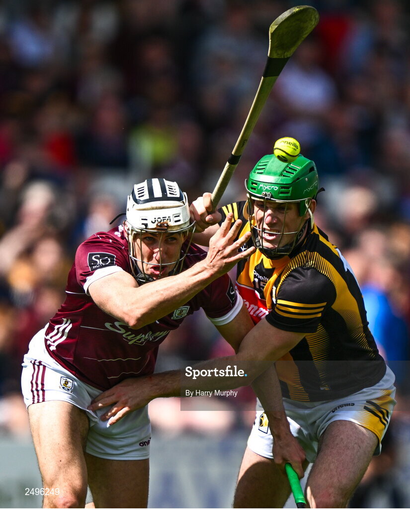 30 April 2023; Daithi Burke of Galway in action against Eoin Cody of Kilkenny during the Leinster GAA Hurling Senior Championship Round 2 match between Kilkenny and Galway at UPMC Nowlan Park in Kilkenny. Photo by Harry Murphy/Sportsfile