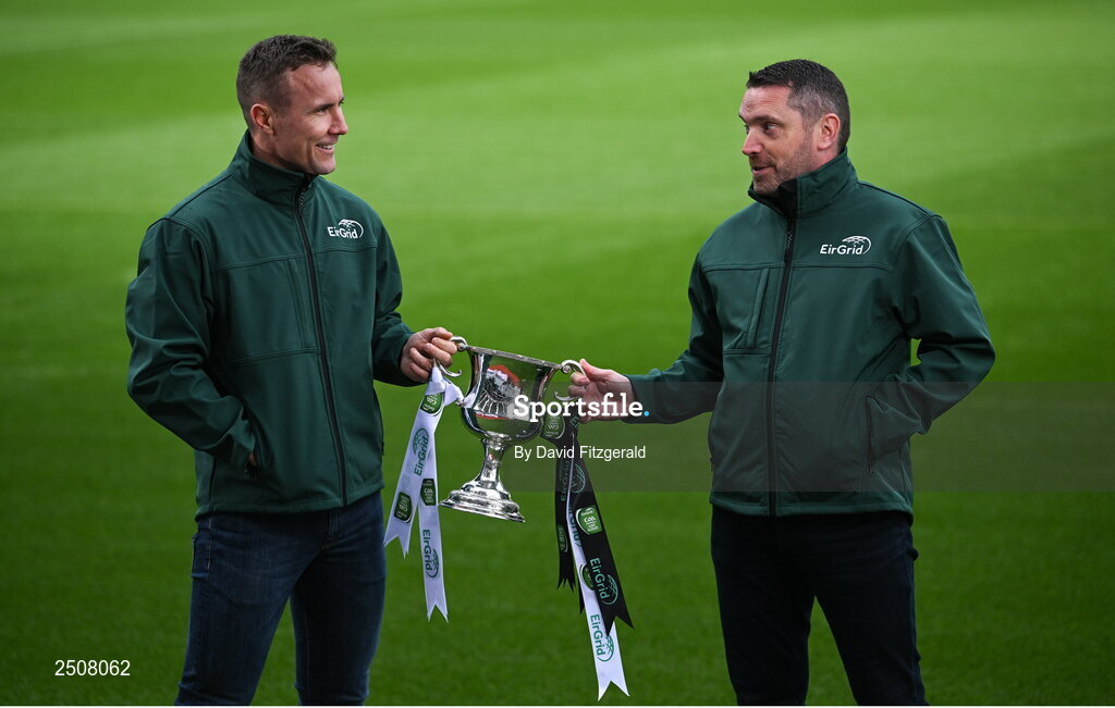 11 May 2023; Brian Flanagan, U20 Kildare manager, left, and Paul Henry, U20 Sligo manager, are pictured at Croke Park in Dublin, ahead of the EirGrid GAA Football U20 All-Ireland Final this Saturday. EirGrid, the state-owned company charged with securing the transition of Ireland’s electricity grid to a low carbon future, has been a proud partner of the GAA since 2015. Photo by David Fitzgerald/Sportsfile