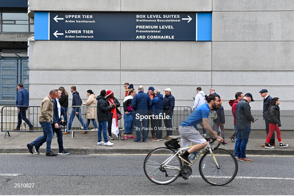 14 May 2023; Spectators outside the ground before the Leinster GAA Football Senior Championship Final match between Dublin and Louth at Croke Park in Dublin. Photo by Piaras Ó Mídheach/Sportsfile
