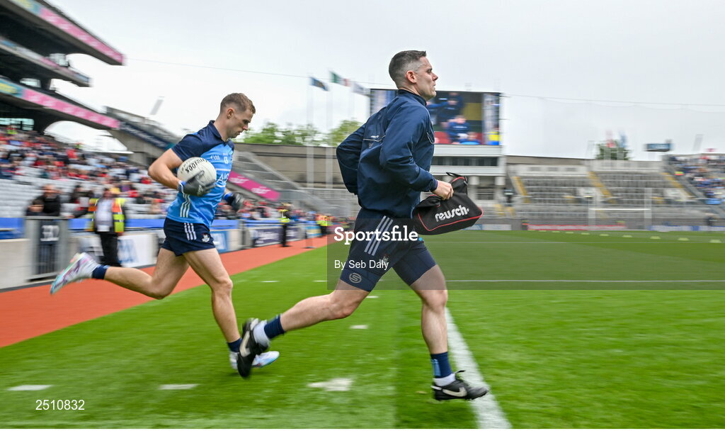 14 May 2023; Dublin goalkeeper Stephen Cluxton, right, and Paul Mannion run out before the Leinster GAA Football Senior Championship Final match between Dublin and Louth at Croke Park in Dublin. Photo by Seb Daly/Sportsfile