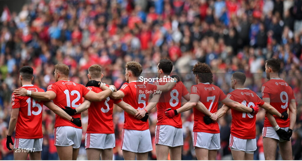14 May 2023; Louth players before the Leinster GAA Football Senior Championship Final match between Dublin and Louth at Croke Park in Dublin. Photo by Seb Daly/Sportsfile