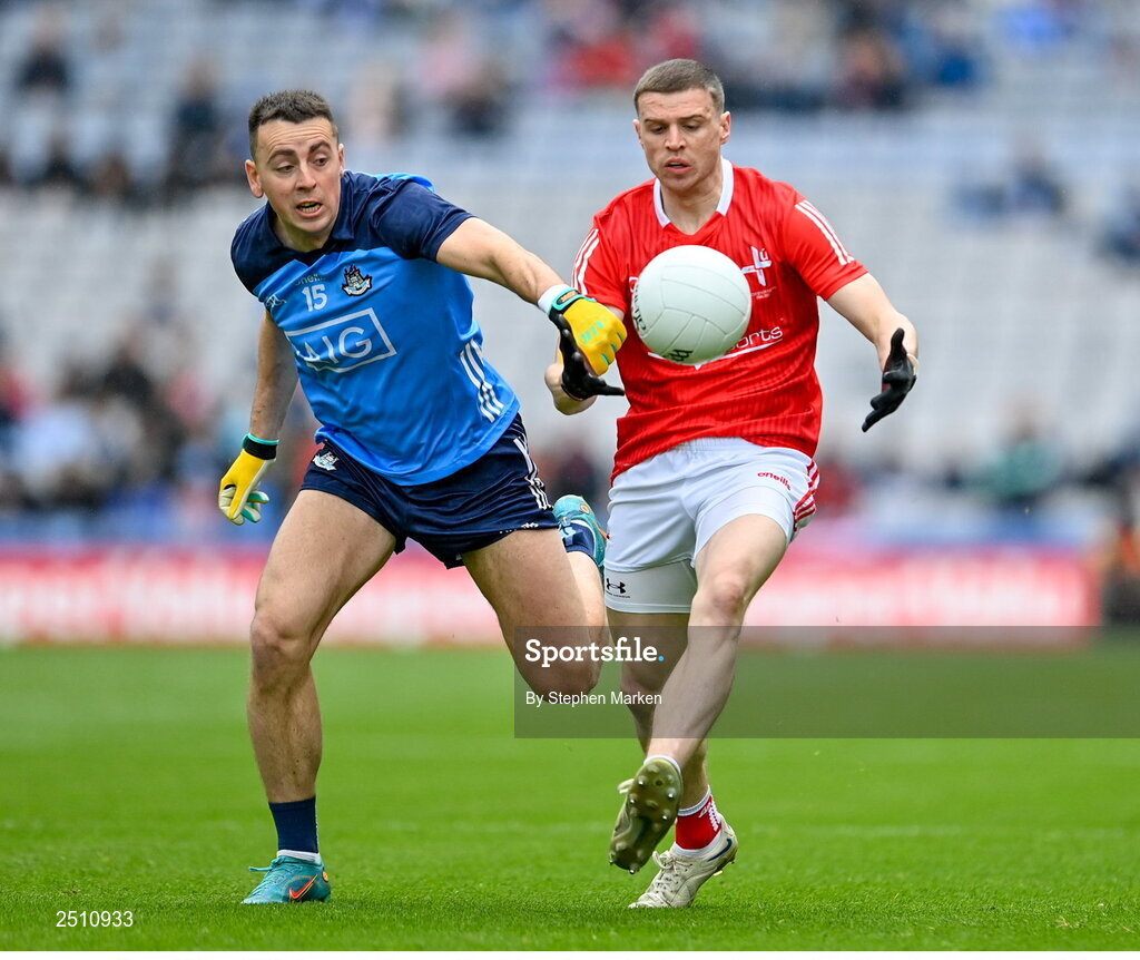 14 May 2023; Conall McKeever of Louth in action against Cormac Costello of Dublin during the Leinster GAA Football Senior Championship Final match between Dublin and Louth at Croke Park in Dublin. Photo by Stephen Marken/Sportsfile