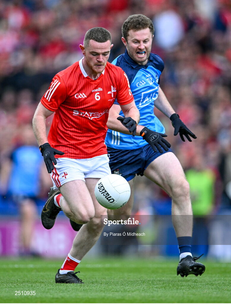 14 May 2023; Niall Sharkey of Louth in action against Jack McCaffrey of Dublin during the Leinster GAA Football Senior Championship Final match between Dublin and Louth at Croke Park in Dublin. Photo by Piaras Ó Mídheach/Sportsfile
