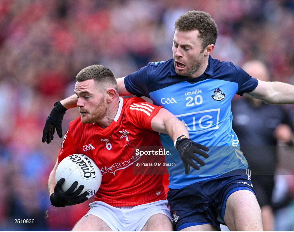 14 May 2023; Niall Sharkey of Louth in action against Jack McCaffrey of Dublin during the Leinster GAA Football Senior Championship Final match between Dublin and Louth at Croke Park in Dublin. Photo by Piaras Ó Mídheach/Sportsfile