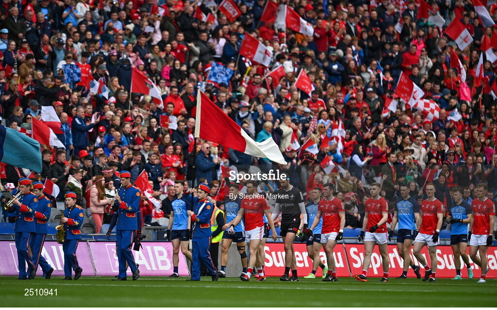 14 May 2023; Both teams parade behind the Artane Band before the Leinster GAA Football Senior Championship Final match between Dublin and Louth at Croke Park in Dublin. Photo by Stephen Marken/Sportsfile