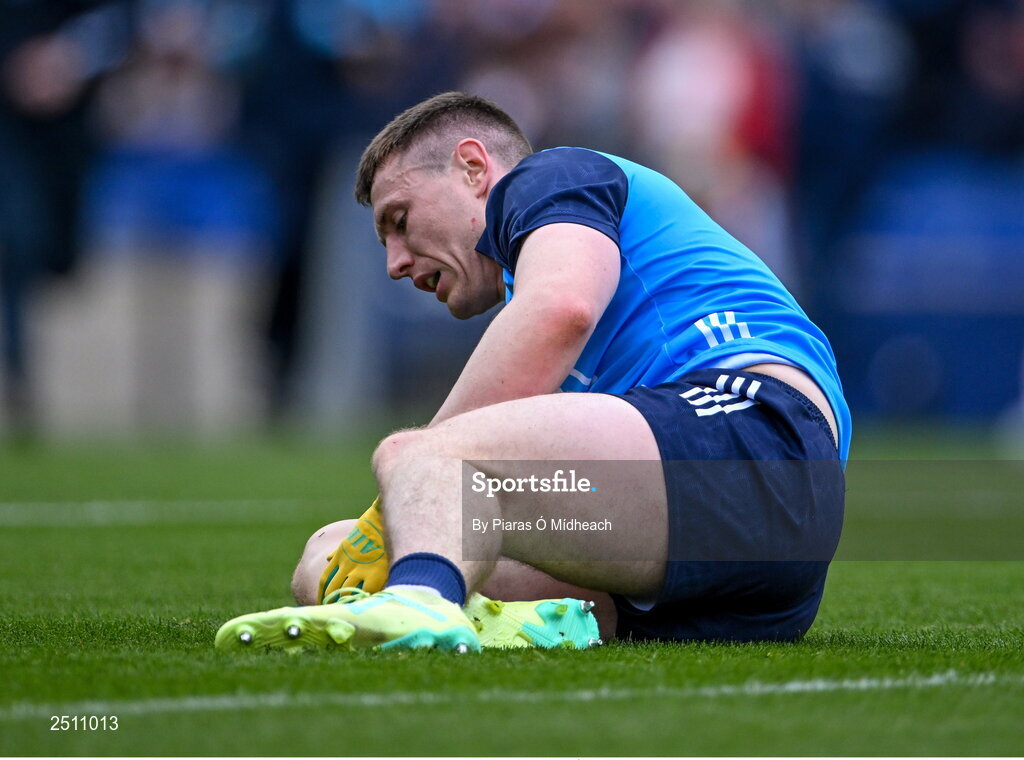 14 May 2023; John Small of Dublin awaits medical attention for an injury during the Leinster GAA Football Senior Championship Final match between Dublin and Louth at Croke Park in Dublin. Photo by Piaras Ó Mídheach/Sportsfile